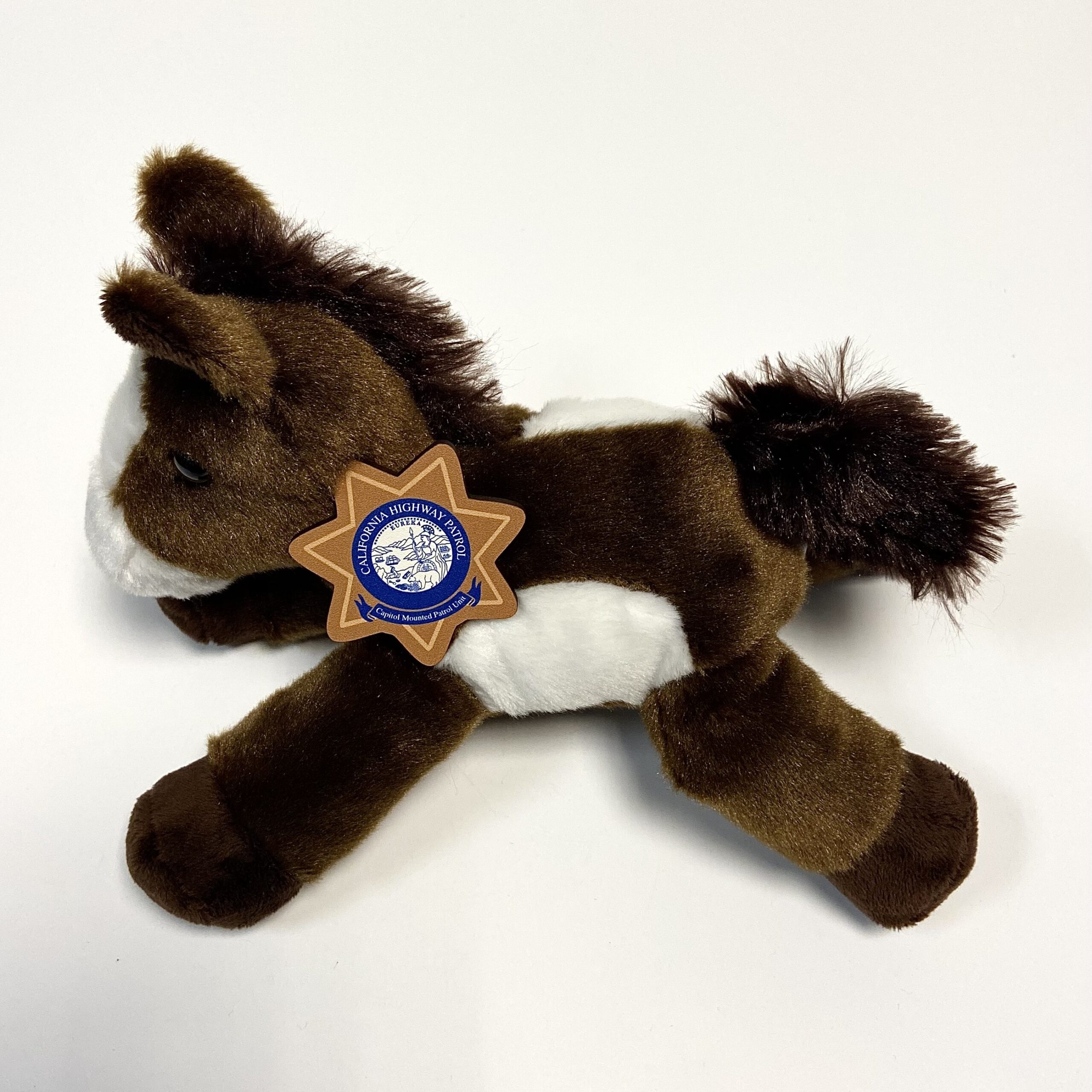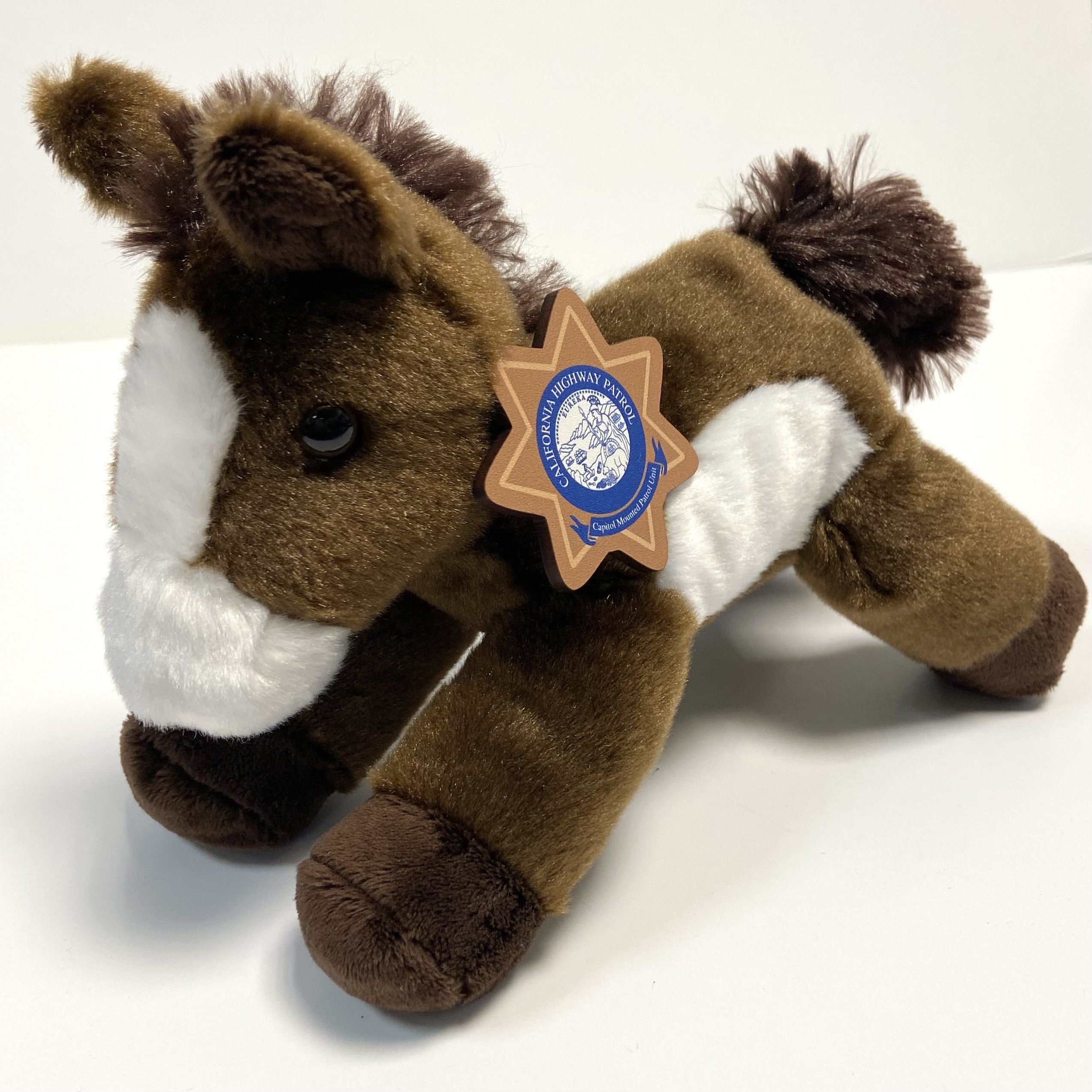 The CHP’s Capitol Protection Section, Mounted Patrol Unit (MPU) officers are responsible for the State Capitol and Capitol Park, as well as patrolling the hundreds of state properties in Downtown Sacramento. Our plush horse combines features from Dozer and Diesel, two horses seen daily in Capitol Park. Wearable wooden badge is 2? high X 2? wide with bar pin closure. Plush horse is 7″ high X 8″ long and made from recycled bottles. Ages 3 and up.