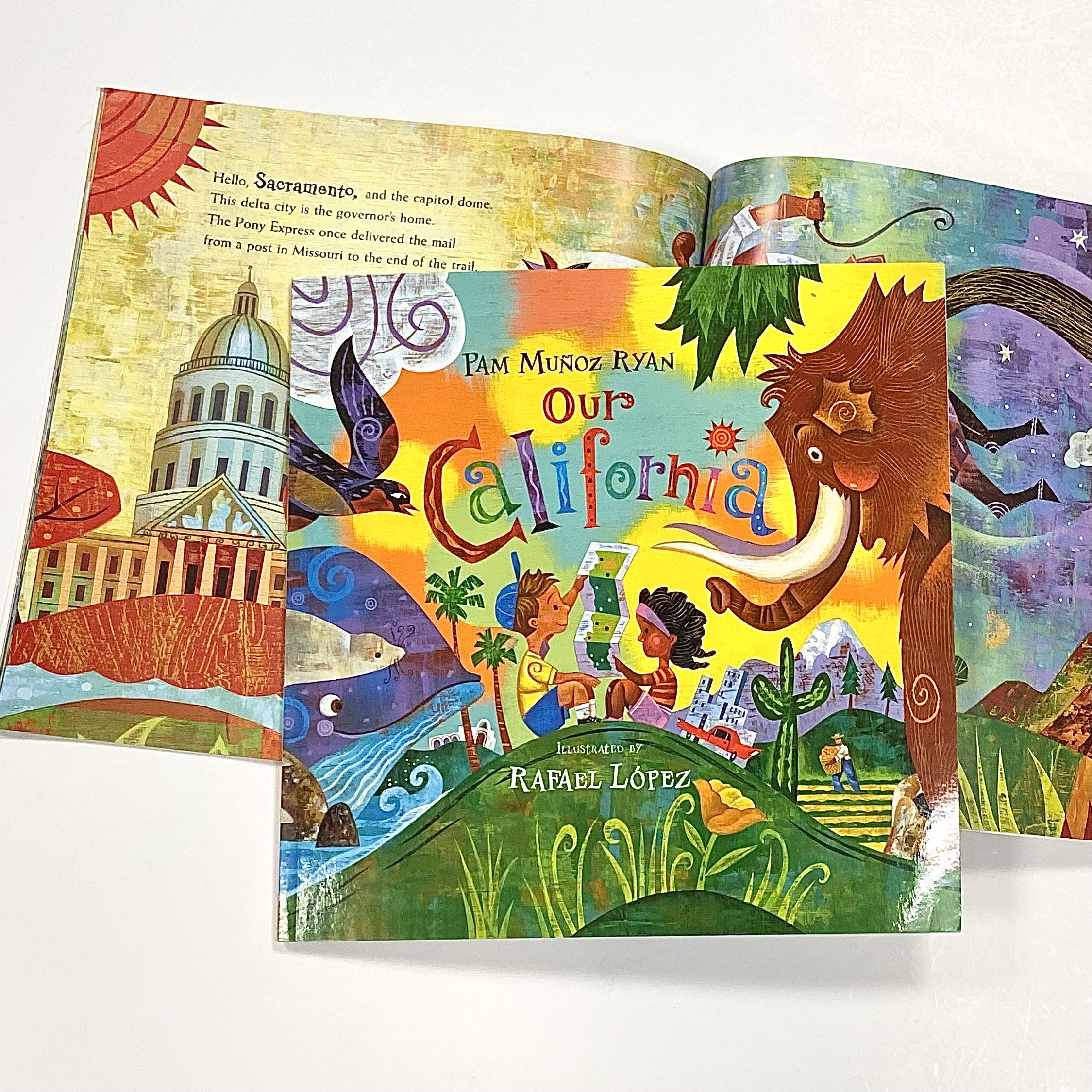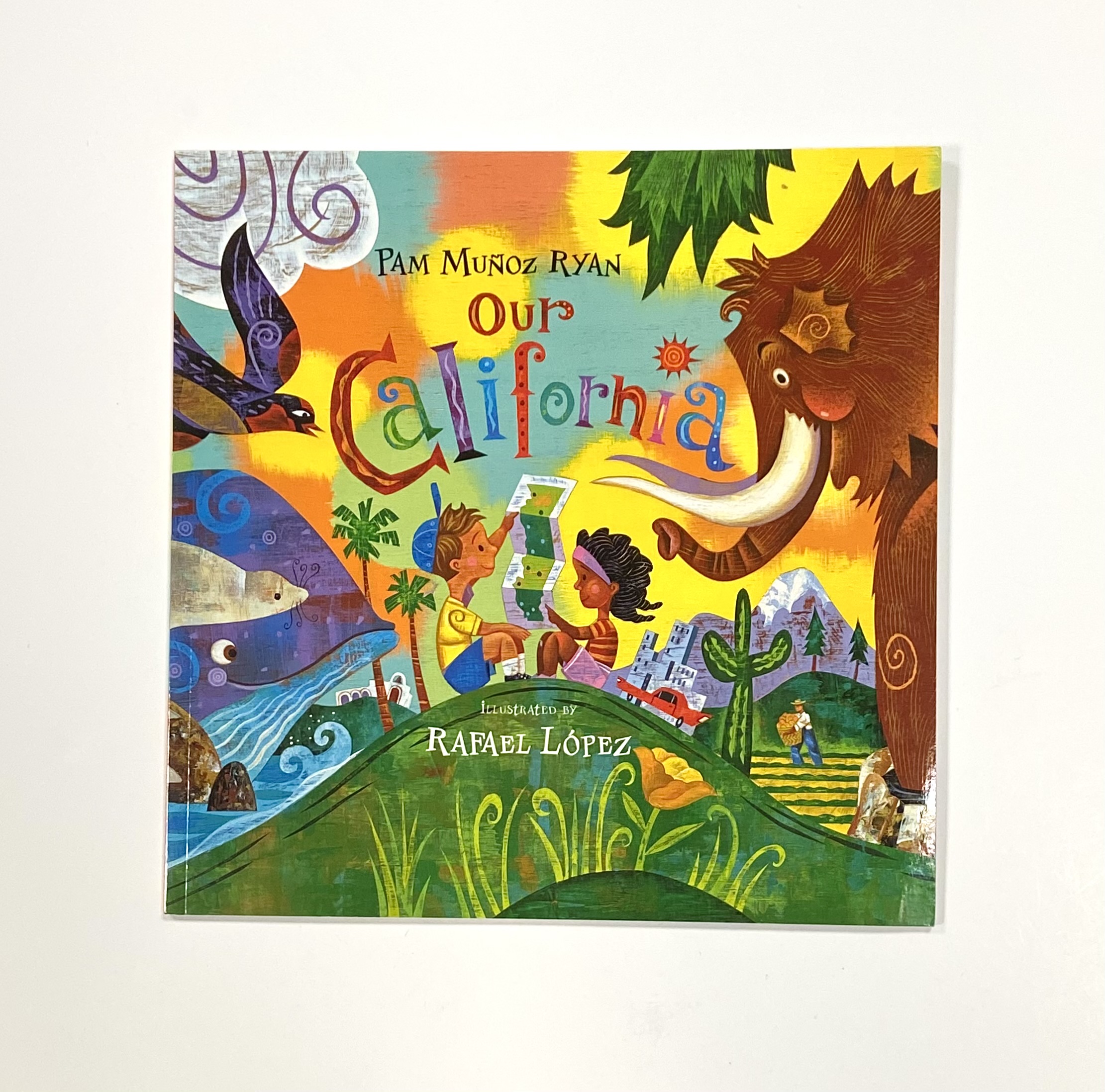 Children’s book featuring poems and vibrant illustrations of California’s major cities and regions, landmarks, history, diversity, and fun facts. The book includes a section on California’s official state symbols featuring the California Bear Flag, Great Seal of California, insect, animal, flower, tree, bird, and more. Pam Munoz Ryan has written over forty books and is the recipient of numerous awards, including the John Newbery Medal, Virginia Hamilton Literary Award, the Willa Cather Award, and many others. Age 6-9 years.