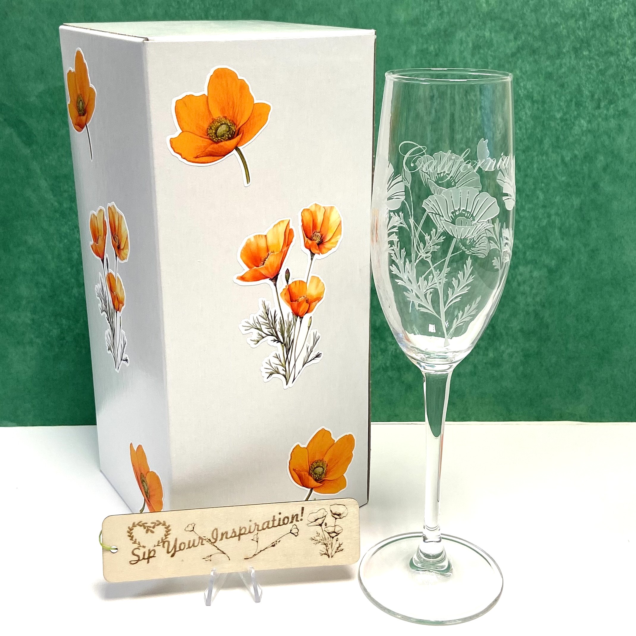 Stemmed champagne glass etched with beautiful California golden poppies. Each gift boxed glass comes with an engraved wooden wine bottle charm displaying a friendly message. 8 oz. Custom made for Capitol Books and Gifts and available exclusively at the museum store.