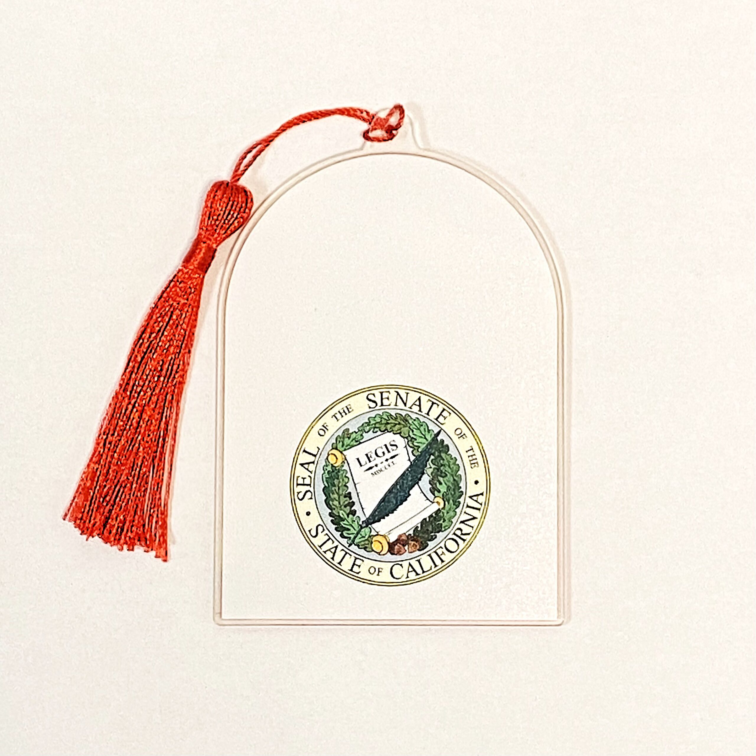 Acrylic bookmark or ornament featuring the dais of the Senate Chamber in the California State Capitol. Custom made for the museum store. 4” high X 2 ¾” wide.